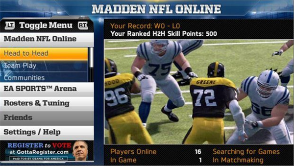 Placarder ses affiches là où on s'y attend le moins, saturer l’espace public de messages, c'est aussi ça le travail des artisans de la campagne d'un candidat. Cet automne, le jeu choisi pour se lancer dans la course à la Maison Blanche par les assistants de Barack Obama est Madden NFL 13. Un jeu de football américain qui s'est vendu en quelques semaines à près de 2 millions d'exemplaires. Un produit très « corporate » avec des valeurs fortes, du jeu d'équipe et un côté populaire qui touchera un maximum de personne. Le genre de « move » médiatique qui peut fleurer le touchdown.