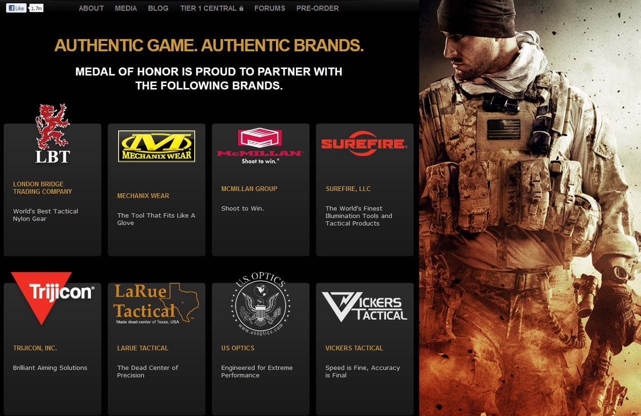 Des noms d'entreprises qui ne vous disent certainement rien, mais qui sont spécialisées dans la confection d'équipements liés à l'armement. L'éditeur justifie son choix en indiquant qu'il espère fournir ainsi aux joueurs le maximum de réalisme et ainsi garantir une immersion optimale aux utilisateurs. De leurs côtés certains journalistes s’interrogent sur la direction qu'imposent ces choix : «Si nous voulons que les jeux vidéo violents restent moralement justifiables, il nous faut absolument préserver la distance entre les FPS et la réalité. »