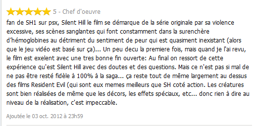 Critique assez complète de Silent Hill et petit clin d'oeil pour la suite (Allociné)
