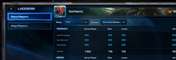 Pour commencer, nous avons intégré un onglet de statistiques par race, qui vous permet de voir vos statistiques de jeu contre chacune des races dans les parties avec classement.